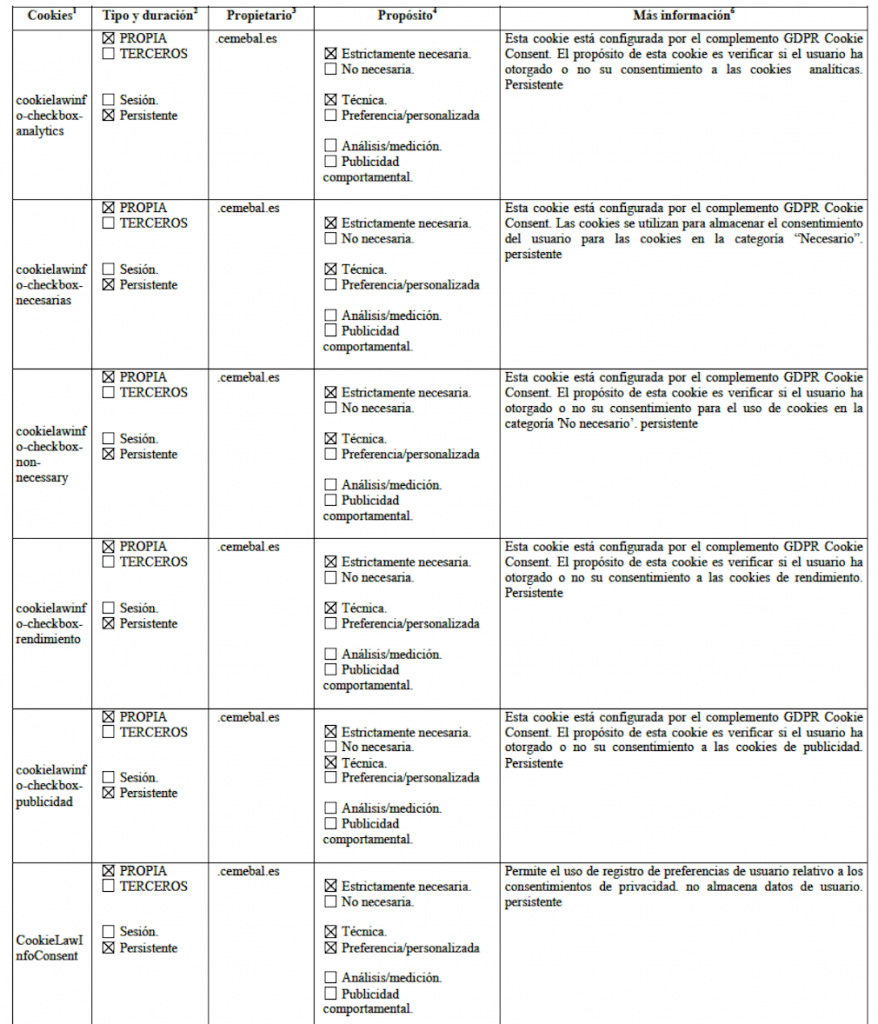Nota: Las cookies de tipo “Propias” son utilizadas sólo por el propietario de esta web y las cookies “De terceros” son utilizadas, también, por el prestador del servicio que está detallado en el cuadro anterior.